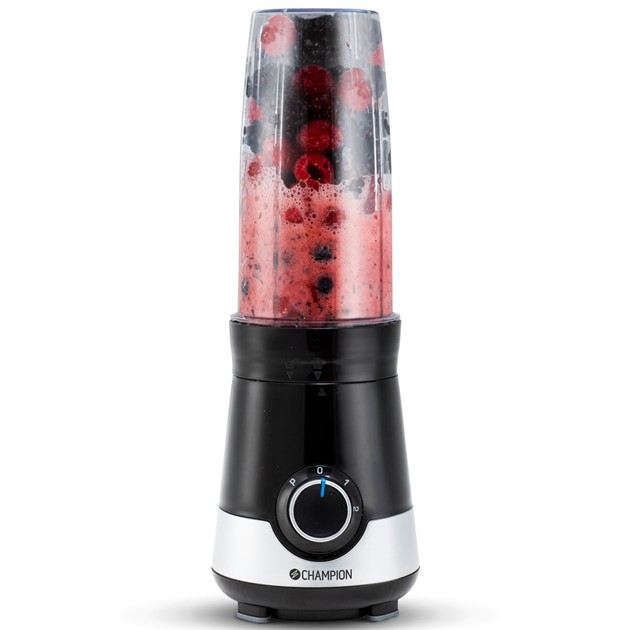 Champions Smoothie Maker-to-go mixar enkelt din smoothie eller proteindryck direkt i bärgaren. Sätt på locket och drycken är klar för att ta med till träningen eller jobbet. De två hastighetslägena, puls-funktionen och knivbladet i rostfritt stål gör att du mixar dina favoritingredienser snabbt och enkelt. Två bägare på 800ml och två lock med drickpip ingår så du alltid har en bägare tillgänglig.