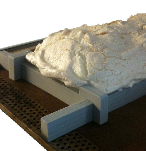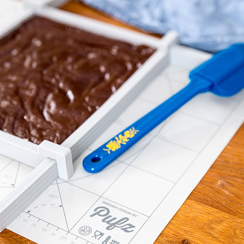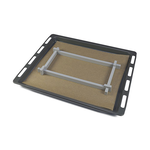Lägg gjut- och bakbalkarna på en plan plåt med ett bakpapper under och ställ in de fyra sidorna till önskat mått. De är 2 cm höga och det finns längsgående markeringar och markeringar i ovankant för varje halv centimeter.