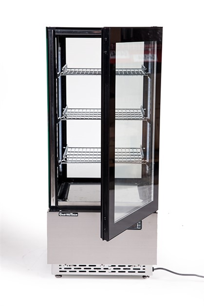 Rostfri 78 liter exponeringskyl i glas med en dörr.