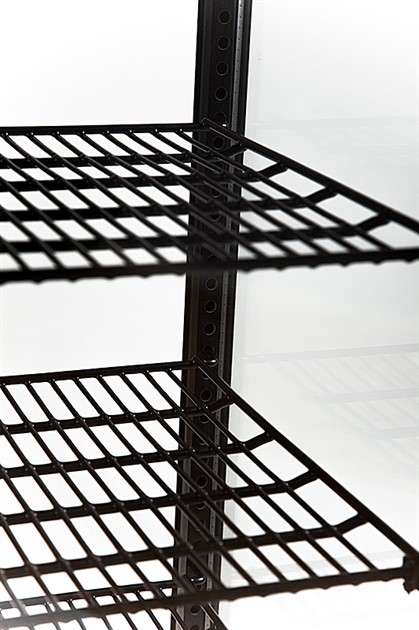 Brilliant LED belysning på alla lodräta stolpar belyser alla hyllplanen.