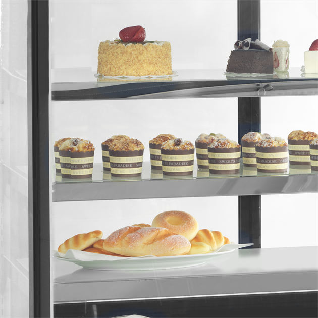 Effektiv ventilation: Det ventilerade kylsystemet säkerställer en jämn temperatur i hela montern (+2°C till +8°C), vilket förlänger hållbarheten på tårtor och känsliga bakverk.