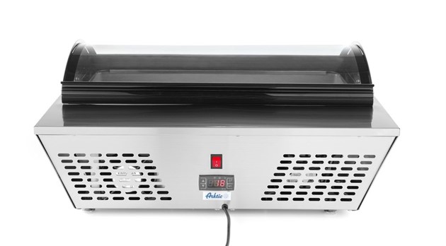 Kylränna / Saladette Display - Rostfritt Stål - 8x GN 1/6 Professionell kylränna för effektiv exponering och förvaring Denna högkvalitativa kylränna från Arktic är designad för professionella kök, bufféer och serveringar som ställer höga krav på både funktion och hygien. Tillverkad i robust rostfritt stål och utrustad med en välvd glashuv, erbjuder den en attraktiv presentation av dina ingredienser samtidigt som de hålls fräscha och lättillgängliga.