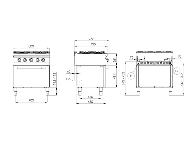 Restaurangspis, gas, med 4 plattor och elektrisk ugn GN1/1.