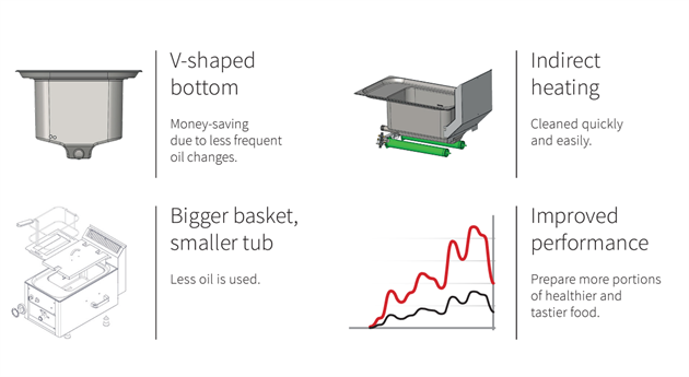 Fritösen har stor fritöskorg i förhållande till sin volym. Det innebär att det krävs mindre olja vid varje byte men den har ändå en hög kapacitet.