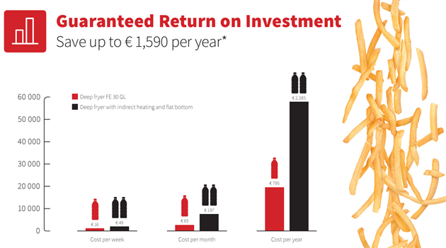 Mindre olja innebär att den också kyls ner snabbare om man stoppar i frusna produkter. Det har man åtgärdat med extra kraftiga gasbrännare. Tack vare fritösens extra starka brännare går det också snabbare att värma upp fritösen vid start. Mätningar visar att det går 23% snabbare än konkurrenterna. Gasfritösen är hela 50% mer effektiv jämfört med en vanlig standard elektrisk fritös.