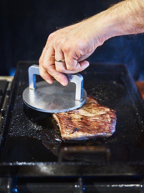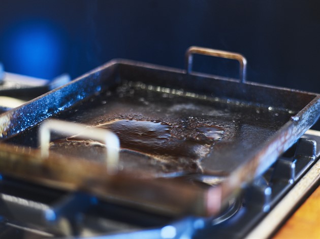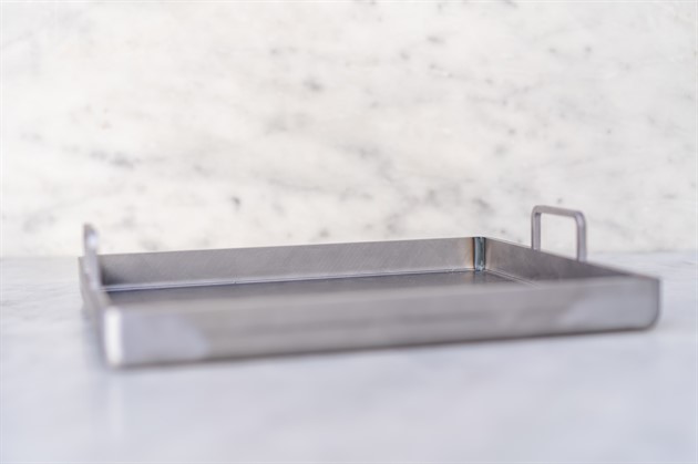 Stekbrickan är tillverkad av 5 millimeter tjockt varmvalsat svenskt kolstål och är producerad i Stockholm. Materialet kommer att skifta färg efter första användningen, efter att du bränt in den. Kolstål får en rödbrun, svartskiftande färg och åldras vackrare och vackrare ju mer du använder stekbrickan.