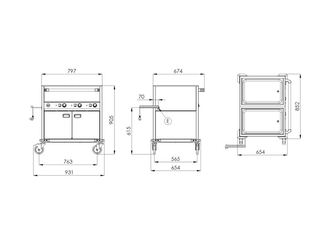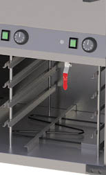 Värmeskåp under vattenbadet till förvaring av kantiner på gejderskenor.
