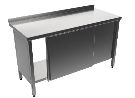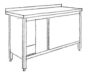 Rostfri arbetsbänk med uppvikt bakkant och skjutdörrar.