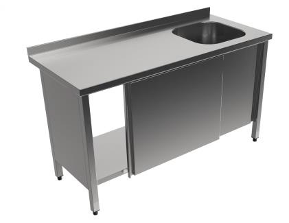 Rostfri diskbänk med disklåda på höger sida och skjutdörrar.
